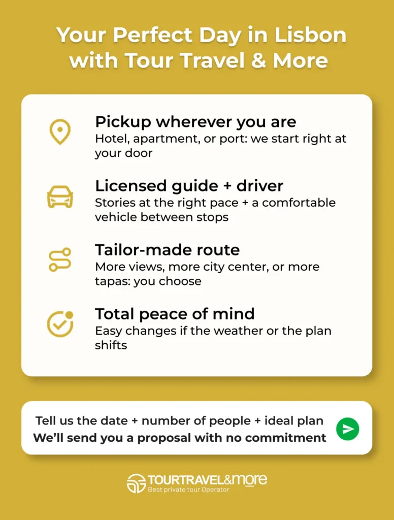 Lisbon isn’t a city for ticking boxes. It’s for enjoying slowly, making good choices, and not fighting logistics. If you want a trip that’s comfortable, flexible, and well organized—whether you’re traveling as a couple, family, or with friends—Tour Travel & More fits well thanks to its way of working: private tours, licensed guides, a vehicle with driver, and a plan tailored to you.