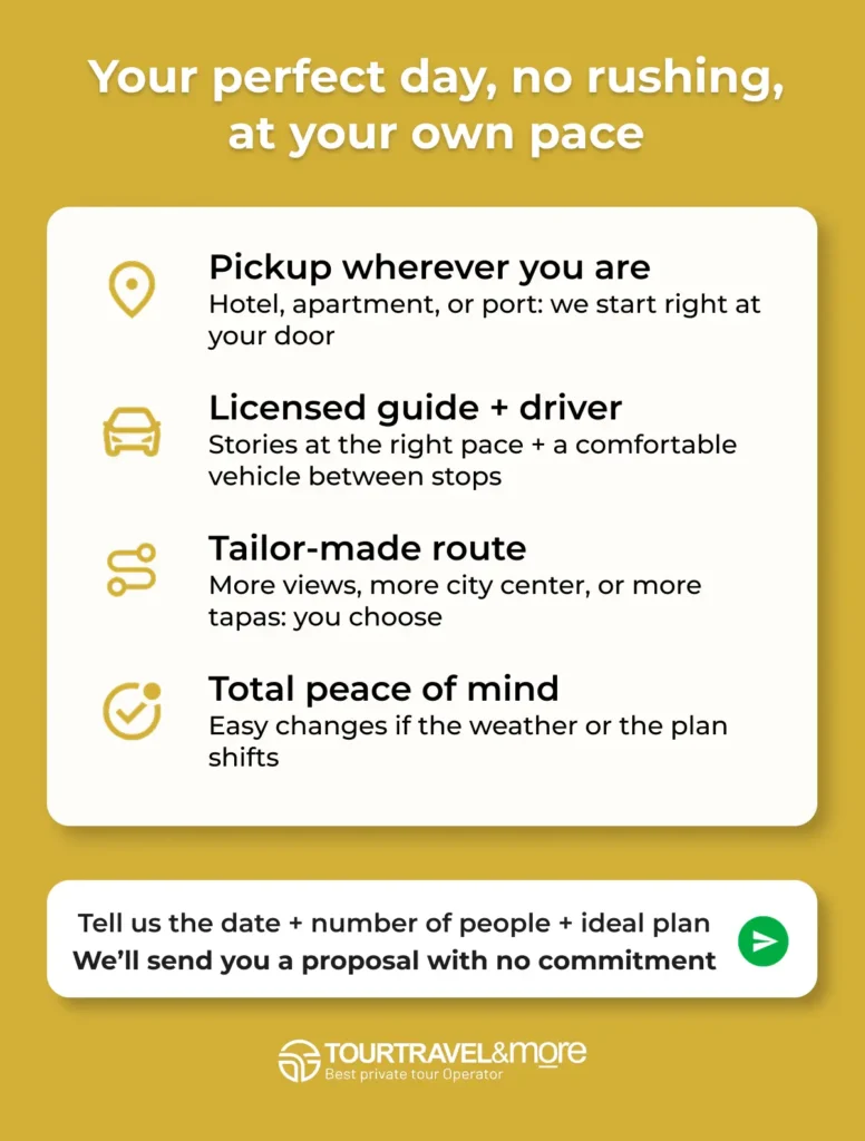 Tell us your date, group size, and what you’re in the mood for (history, views, or tapas). We’ll send you a clear proposal with no pressure. You choose the playlist for the ride—we’ll make sure the day flows.