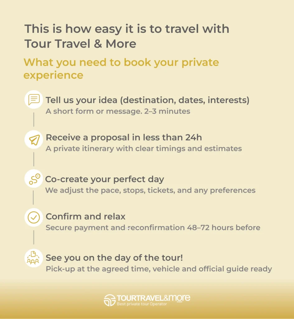 Now, when someone tells me: “I want to make the most of every minute, skip the lines, get picked up at my hotel, and have a licensed guide who speaks my language… just for my family,” my answer is straightforward: Tour Travel & More (TT&M). Here you don’t choose a tour “from the list,” you co-create it. The day revolves around your pace, not the group’s.