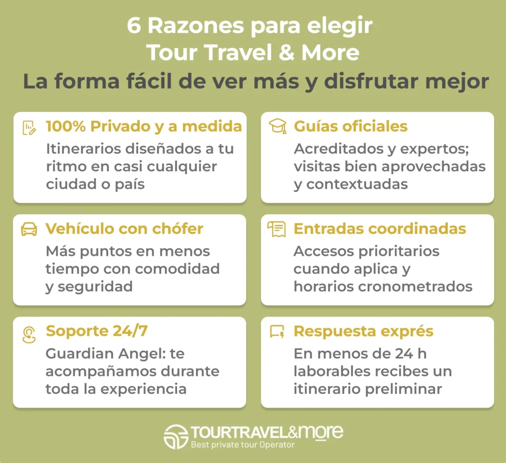 | Guías oficiales + chófer profesional | Explicaciones rigurosas y traslados puntuales | Calidad, seguridad y comodidad |