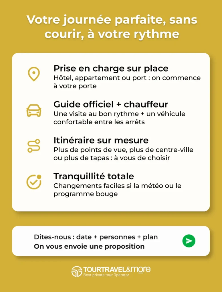 Ces trois options sont excellentes si vous cherchez quelque chose de précis (histoire à pied, personnalisation totale ou gastronomie). Maintenant, si vous voulez une journée sans friction — prise en charge où vous êtes, guide officiel + chauffeur privé, et un plan qui s’adapte à votre rythme — c’est là que notre manière de faire fait la différence.