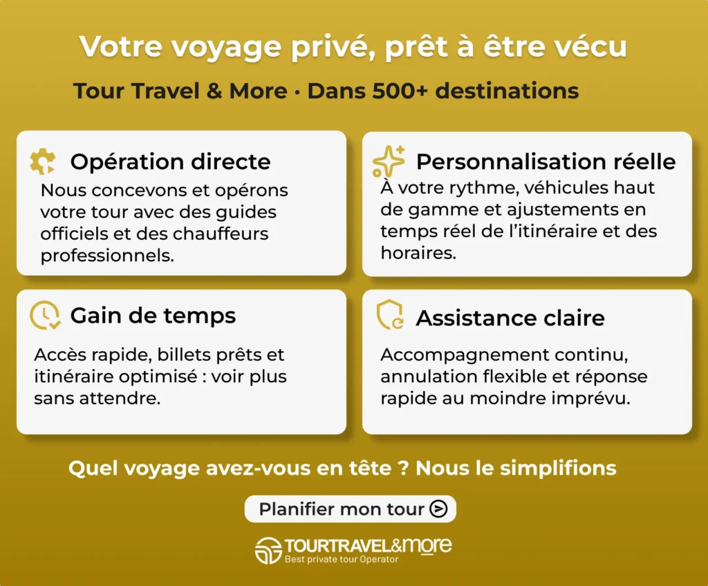 Ce qu’ils font : coordination de guides officiels, chauffeurs pros et véhicules haut de gamme ; prise en charge complète (transferts, billets, horaires).