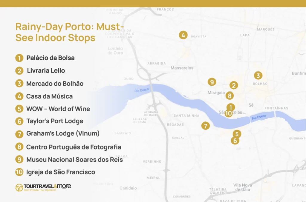 - Wine lodges in Vila Nova de Gaia: guided tastings, history, and warmth. Ideal for a full afternoon if it’s pouring.